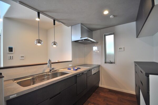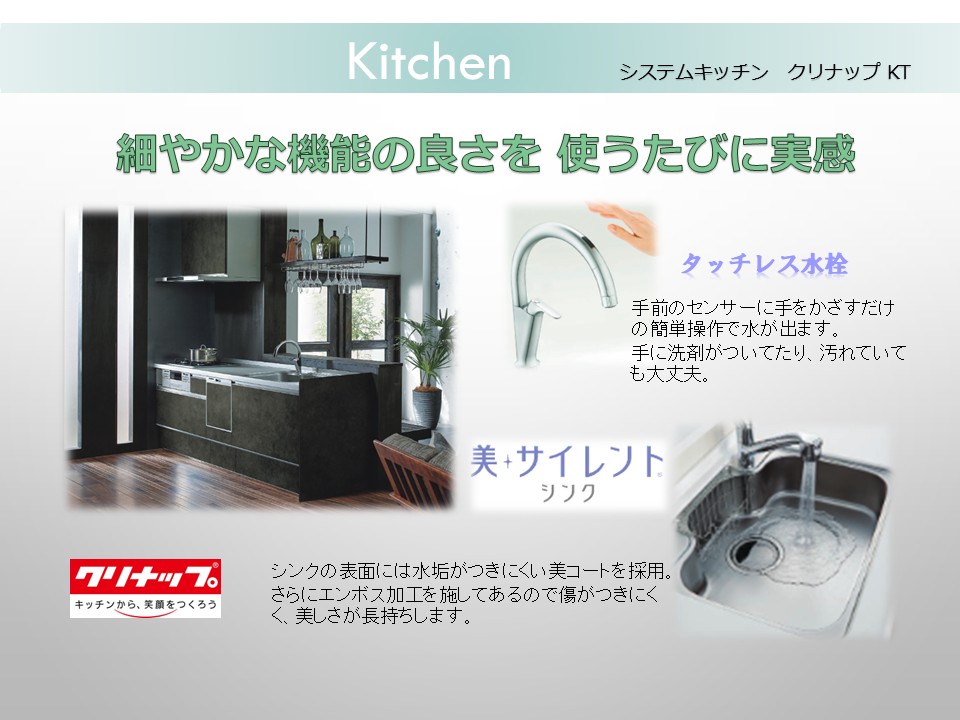 システムキッチン:多機能で使い易さを追求しながらもスタイリッシュ。毎日の家事負担の軽減を考えつくされた設計です。