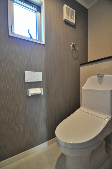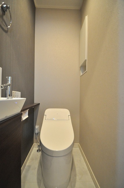手洗いカウンター付き:スタイリッシュでセンスの良いトイレ空間。収納キャビネット付きの手洗い器ならお客様のご利用時にも活躍します。