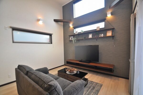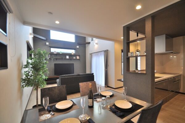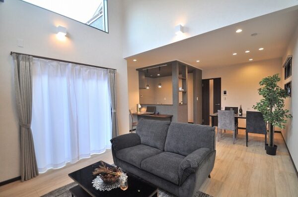 LDKは18.7帖の広さを確保。リビング上部には約4mの天井高の吹抜けを設け開放感ある明るい空間になっております。