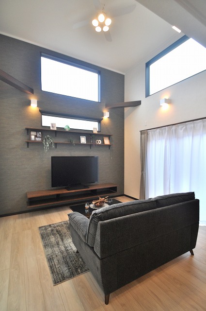 リビング吹抜け 立体空間が広がることで開放感が生まれます。シーリングファン付きで冷暖房の効率を上げて電気代の節約につながります。