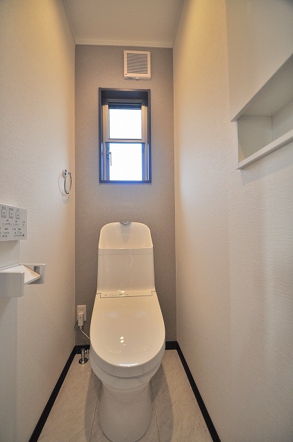 • 手洗いカウンター付き:スタイリッシュでセンスの良いトイレ空間。収納キャビネット付きの手洗い器ならお客様のご利用時にも活躍します。