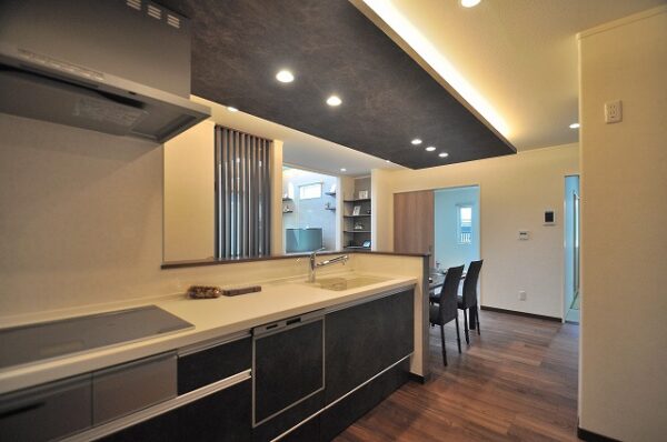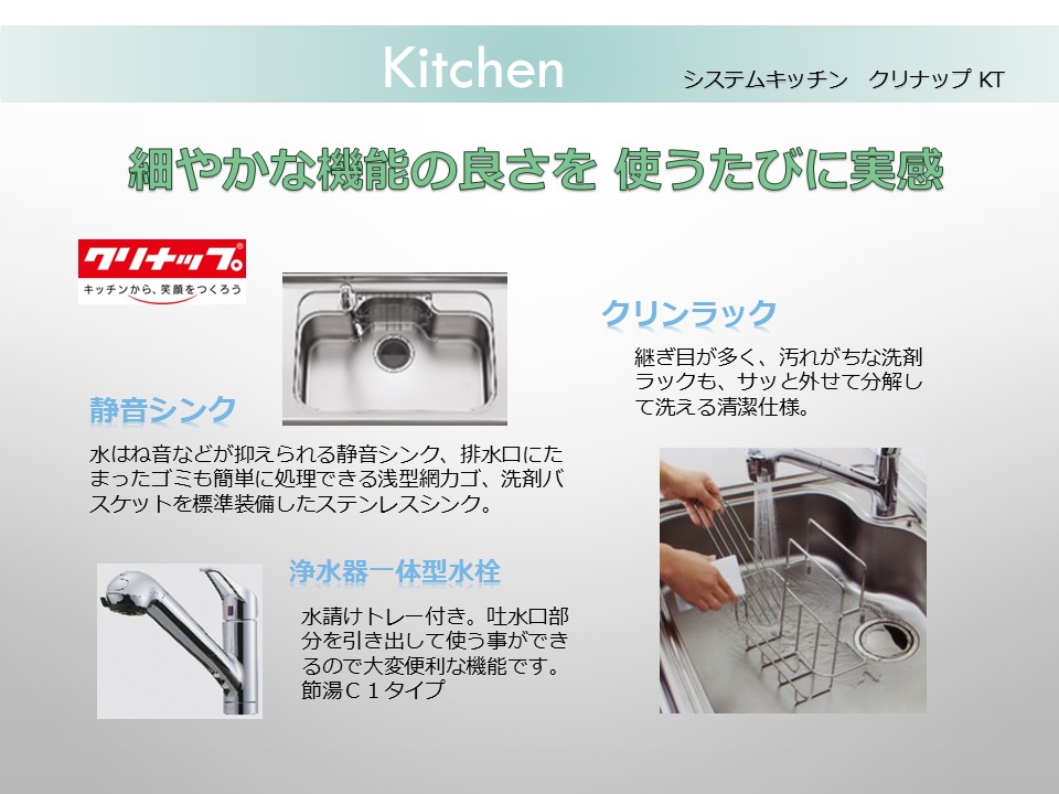 システムキッチン:多機能で使い易さを追求しながらもスタイリッシュ。毎日の家事負担の軽減を考えつくされた設計です。