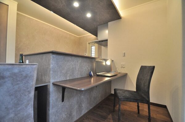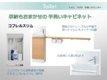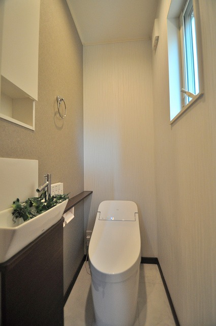 手洗いカウンター付き:スタイリッシュでセンスの良いトイレ空間。収納キャビネット付きの手洗い器ならお客様のご利用時にも活躍します。