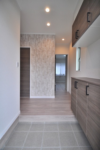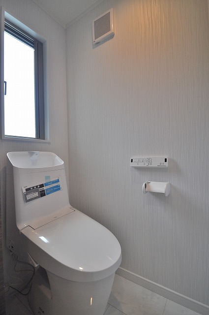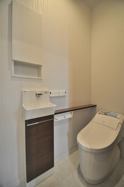 1Fトイレ手洗いカウンター:小型でお洒落な手洗いの付いたキャビネット。掃除用具も見えずに収納。来客時にも喜ばれるワンランク上のトイレです。