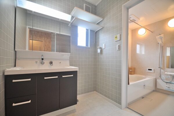 洗面化粧台:平らな底面で広々使いやすく、ハイバックガード一体ボウルだから汚れにくくてお手入れも簡単です。
