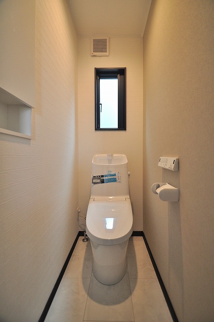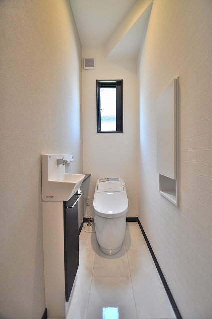 1Fトイレ手洗いカウンター:小型でお洒落な手洗いの付いたキャビネット。掃除用具も見えずに収納。来客時にも喜ばれるワンランク上のトイレです。