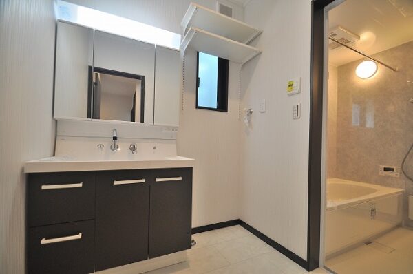洗面化粧台:平らな底面で広々使いやすく、ハイバックガード一体ボウルだから汚れにくくてお手入れも簡単です。