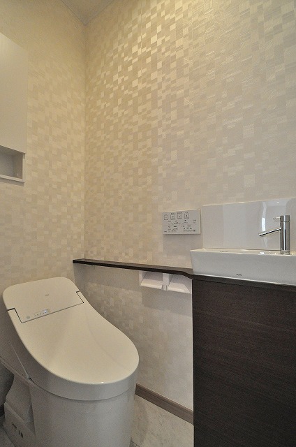 TOTO製の節水型タンクレストイレを採用し、すっきりとしたデザインに。独立した手洗い器を設け、来客時にも気持ちよくお使いいただけます。清潔感と上品さを兼ね備えた、毎日が快適になる空間です。