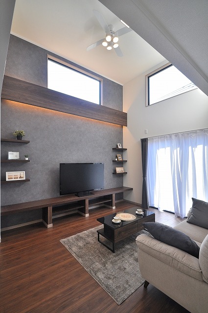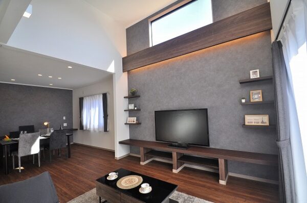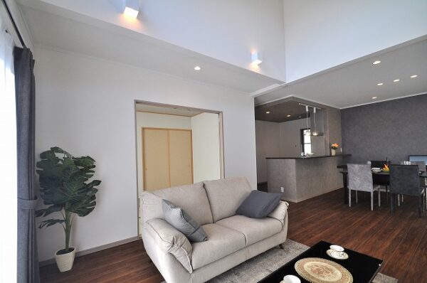 LDKは19.7帖の広さを確保。約4mの吹き抜けと南面の掃き出し窓で明るく開放的なリビング。家族が自然と集まる、心地よい団らん空間を演出します。
