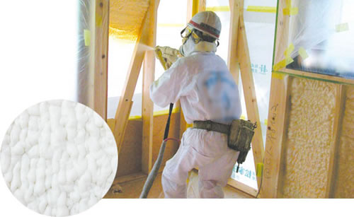 吹付硬質ウレタンフォームとは、ポリウレタン樹脂を主成分として、発泡させたスポンジ状の断熱材です。小さな硬い泡の集合体である「硬質ウレタンフォーム」の中には、熱を伝えにくい空気が閉じ込められているため、優れた断熱性が得られます。