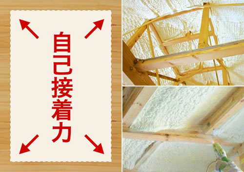 住宅の隅から隅まで家全体をすっぽりと覆う”現場吹き付け発泡”による断熱工事を行うため、窓や筋交い周辺等の細かい部分にも隙間なく充填でき、高い気密性を実現します。気密性が高いと、断熱材本来の性能が発揮され、効率的な冷暖房効果をもたらします。 また、他の断熱材料にはない“自己接着力”のおかげで、柱や梁との間に隙間ができにくく湿気も遮断するため、壁内結露やカビの発生をおさえ、建物を永く大切に使うことが出来ます。